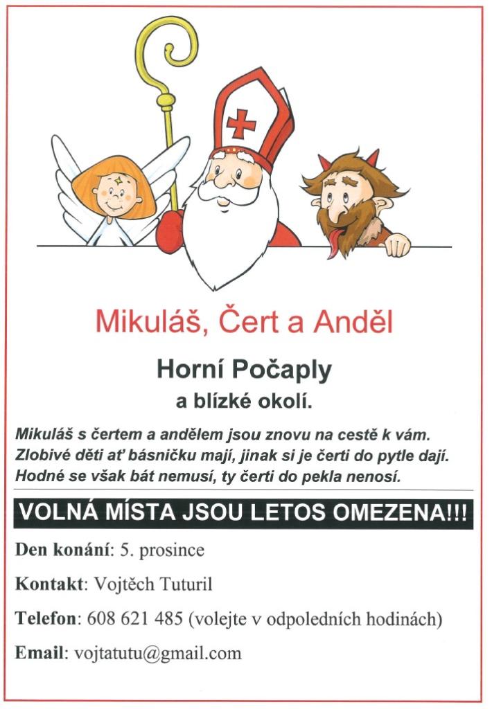 Mikuláš, čert a anděl se ve čtvrtek 5. prosince vydávají na cestu za dětmi po domech a bytech v Horních Počaplech a okolí. Pozvete je k sobě domů?